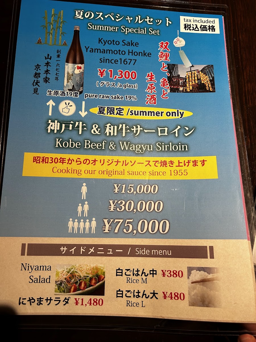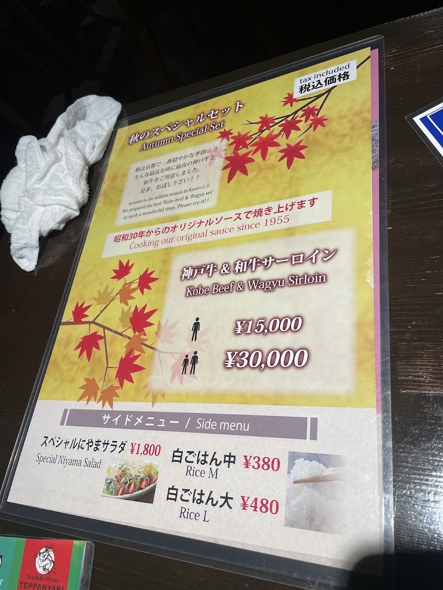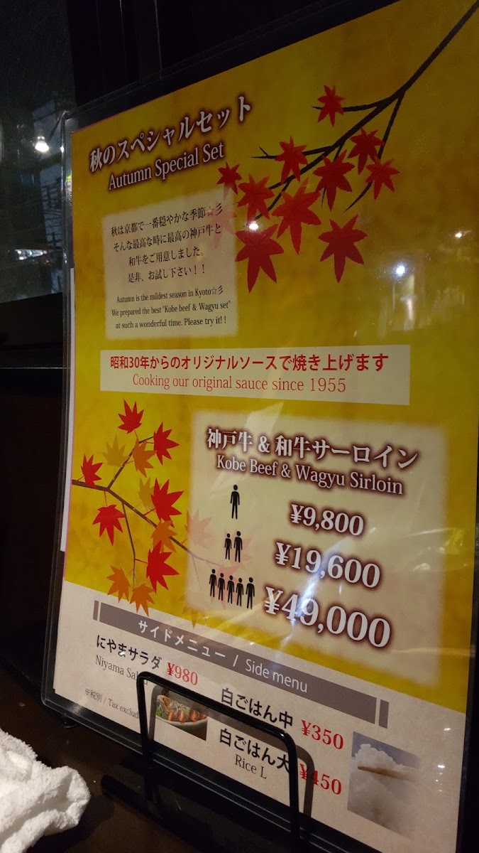 [1 minute walk from Kyoto Kawaramachi Station on the Hankyu Kyoto Line / 3 minutes walk from Gion-Shijo Station on the Keihan Main Line] Niyama is a Kobe beef and Japan's finest beef specialty store founded in 1955. Enjoy professionally prepared Kobe beef and carefully selected Wagyu beef with refined cooking, which is possible only at a long-established store. We offer a variety of menus perfect for special occasion dinners, such as a luxurious teppanyaki full course, a "Kobe beef debut set," and a "Wagyu beef set" where you can compare three types of Wagyu beef. Please use it for various occasions such as meals with important people, entertaining, celebrations, anniversaries, etc. We welcome customers from overseas. Please stop by to make a memory of your trip to Kyoto.
